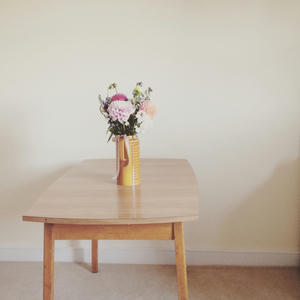 テーブルももらいもの、花瓶はひろったポット。花束はプレゼント。